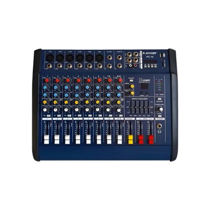 La Apoge PC-10 es una consola mezcladora analógica de 10 canales, ideal para músicos, DJs y productores que buscan calidad de sonido, versatilidad y fácil operación. Ofrece entradas XLR, permitiendo conectar micrófonos condensadores o dinámicos sin pérdida de calidad. Diversos efectos digitales, perfectos para realzar voces e instrumentos en presentaciones en vivo o grabaciones. También dispone de conectividad USB, permitiendo reproducir y grabar directamente desde una computadora o pendrive.