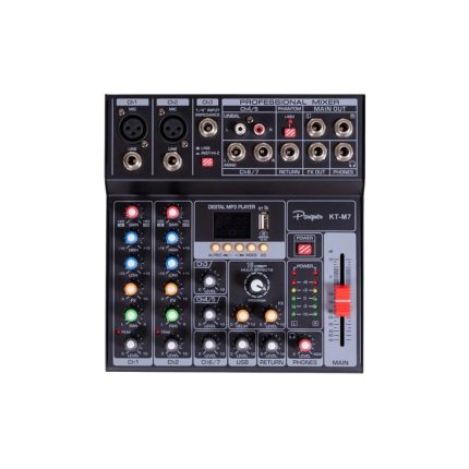La Parquer KT-M7 es una consola de mezcla versátil y portátil, diseñada para músicos y técnicos que buscan una solución completa y económica sin resignar calidad. Cuenta con 7 canales de entrada, efectos digitales DSP, entradas balanceadas XLR/TRS, y ecualización de 3 bandas, logrando un sonido claro y preciso. Además, ofrece puerto USB y conexión Bluetooth, permitiendo reproducir música directamente desde dispositivos móviles.