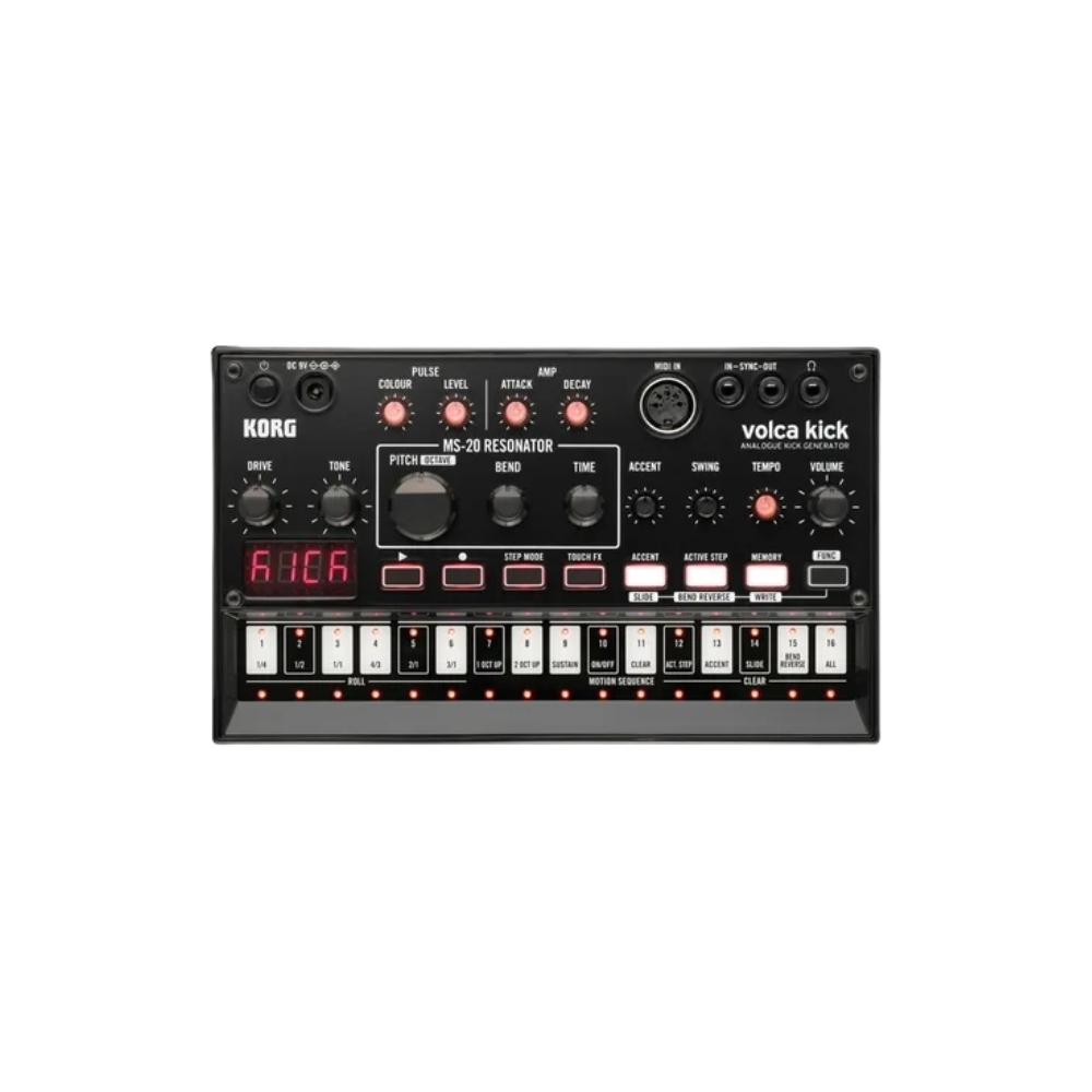 El KORG volca kick es un generador analógico de bombos diseñado para crear kicks potentes, profundos y totalmente personalizables. Basado en el circuito del clásico filtro resonante de KORG, permite modelar desde bombos suaves y redondos hasta kicks agresivos y distorsionados para música electrónica.